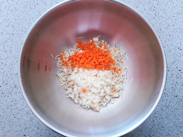 볼에 팽이버섯, 당근, 양파를 넣고