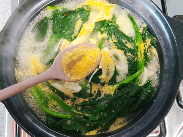 시금치국 육수가 보글보글 끓어오르려 할 때,
