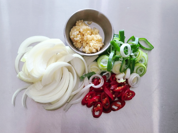 홍고추는 어슷 썰고, 다진 마늘 1큰술을