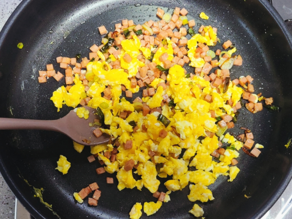 부드럽게 익은 스팸을 팬 한쪽에 밀어놓고