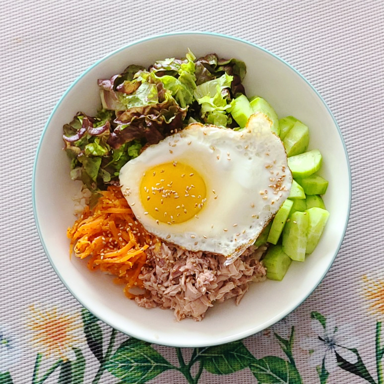 안녕하세요^^ 혼자서 혼밥으로 간단하면서 맛있고 건강하게 먹고 싶은 마음에집에 있는 재료들로 오이 참치비빔밥을만들어 먹었어요 오이 참치비빔밥 레시피는 캔 참치와 좋아하는 채소를 준비하고계란 후라이를 반숙으로 만들어 올린 다음에비빔밥 양념장을 올려주면간단하게 참치 오이비빔밥을 완성할 수 있어요 오이 참치비빔밥 양념장은 빨갛게 만들지 않고 간장 양념과들기름, 알룰로스로 자극적이지 않은간장 양념장을 만드시면 되세요 ▶재료 (1인분)◀밥 150g참치 캔 100g상추 2장 6g오이 35g당근라페 25g계란 1개올리브오일 약간 ▶비빕밥 양념장 만들기◀진간장 1큰술알룰로스 0.3큰술들기름 1큰술통깨 넉넉하게 (큰술: 밥 숟가락 계량)1. 상추 세척 & 썰기 상추는 지저분한 아래쪽을 손질 하고손바닥 위에 올려..